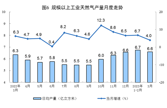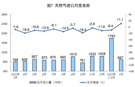 天然氣生產(chǎn)有所放緩,進(jìn)口由降轉(zhuǎn)增。3月份,生產(chǎn)天然氣205億立方米,同比增長4.0%,增速比1—2月份放緩2.7個(gè)百分點(diǎn),日均產(chǎn)量6.6億立方米。進(jìn)口天然氣887萬噸,同比增長11.1%,1—2月份為下降9.4%。