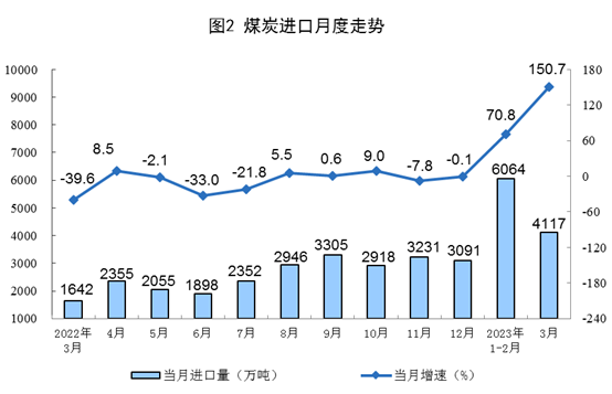 原煤生產(chǎn)穩(wěn)定增長,進(jìn)口大幅增加。3月份,生產(chǎn)原煤4.2億噸,同比增長4.3%,增速比1—2月份放緩1.5個(gè)百分點(diǎn),日均產(chǎn)量1346萬噸。進(jìn)口煤炭4117萬噸,同比增長150.7%,增速比1—2月份加快79.9個(gè)百分點(diǎn)。