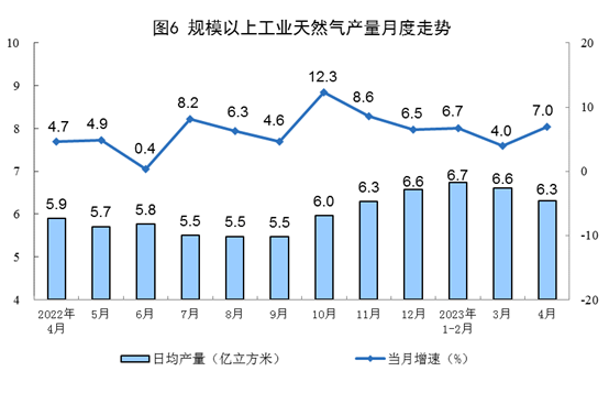 天然氣生產(chǎn)增速加快,進(jìn)口保持較快增長(zhǎng)。4月份,生產(chǎn)天然氣189億立方米,同比增長(zhǎng)7.0%,增速比3月份加快3.0個(gè)百分點(diǎn),日均產(chǎn)量6.3億立方米。進(jìn)口天然氣898萬(wàn)噸,同比增長(zhǎng)11.0%,增速比3月份放緩0.6個(gè)百分點(diǎn)。
