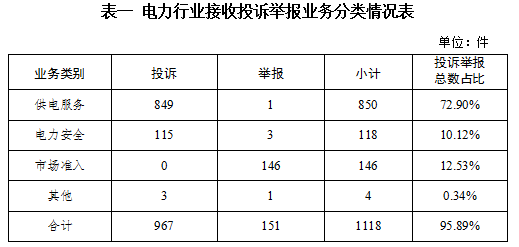 電力行業(yè)排在首位,數(shù)量為1118件、占投訴舉報(bào)總數(shù)的95.89%,主要集中在供電服務(wù)、市場準(zhǔn)入、電力安全等方面。