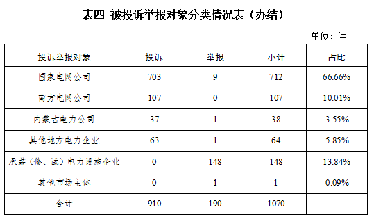 從被投訴舉報(bào)對(duì)象看,供電企業(yè)921件、占投訴舉報(bào)總數(shù)的86.07%,其中國家電網(wǎng)公司712件、占比66.66%,南方電網(wǎng)公司107件、占比10.01%,內(nèi)蒙古電力公司38件、占比3.55%,其他地方電力企業(yè)64件、占比5.85%;承裝(修、試)電力設(shè)施企業(yè)148件、占比13.84%;其他市場主體1件、占比0.09%。