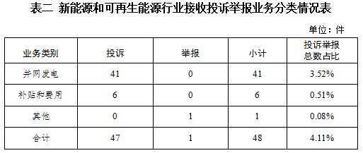 新能源和可再生能源行業(yè)排在第二位,數(shù)量為48件、占投訴舉報(bào)總數(shù)的4.11%,主要集中在并網(wǎng)發(fā)電、補(bǔ)貼和費(fèi)用等方面。