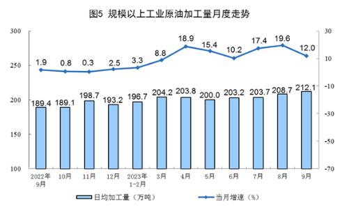 原油生產(chǎn)平穩(wěn)增長(zhǎng),進(jìn)口較快增長(zhǎng)。9月份,生產(chǎn)原油1687萬(wàn)噸,同比增長(zhǎng)0.3%,增速比8月份放緩2.8個(gè)百分點(diǎn),日均產(chǎn)量56.2萬(wàn)噸。進(jìn)口原油4574萬(wàn)噸,同比增長(zhǎng)13.7%,增速比8月份回落17.2個(gè)百分點(diǎn)。