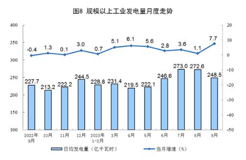電力生產(chǎn)增速加快。9月份,發(fā)電量7456億千瓦時(shí),同比增長(zhǎng)7.7%,增速比8月份加快6.6個(gè)百分點(diǎn),日均發(fā)電248.5億千瓦時(shí)。1—9月份,發(fā)電量66219億千瓦時(shí),同比增長(zhǎng)4.2%。