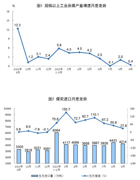 原煤生產(chǎn)保持穩(wěn)定,進(jìn)口快速增長(zhǎng)。9月份,生產(chǎn)原煤3.9億噸,同比增長(zhǎng)0.4%,增速比8月份放緩1.6個(gè)百分點(diǎn),日均產(chǎn)量1310萬(wàn)噸。進(jìn)口煤炭4214萬(wàn)噸,同比增長(zhǎng)27.8%,增速比8月份回落23.0個(gè)百分點(diǎn)。