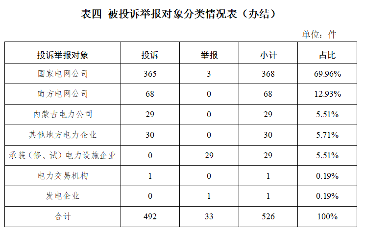 從被投訴舉報對象看,供電企業(yè)495件、占投訴舉報總數(shù)的94.10%,其中國家電網(wǎng)公司368件,占比69.96%;南方電網(wǎng)公司68件,占比12.93%;內(nèi)蒙古電力公司29件,占比5.51%;其他地方電力企業(yè)30件,占比5.71%;承裝(修、試)電力設施企業(yè)29件,占比5.51%;發(fā)電企業(yè)1件,占比0.19%;電力交易機構(gòu)1件,占比0.19%。