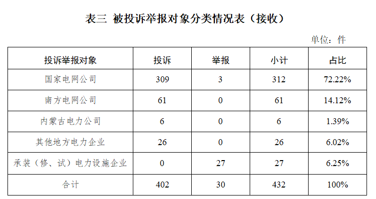 電力行業(yè)排在首位,數(shù)量為419件、占投訴舉報總數(shù)的96.99%,主要集中在供電服務、市場準入、電力安全等方面。