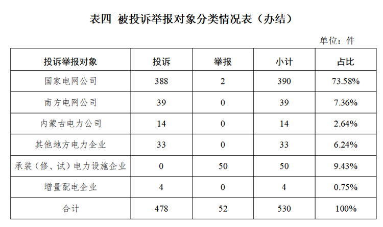 從被投訴舉報(bào)對(duì)象看,供電企業(yè)476件、占投訴舉報(bào)總數(shù)的89.82%,其中國(guó)家電網(wǎng)公司390件、占比73.58%;南方電網(wǎng)公司39件、占比7.36%;內(nèi)蒙古電力公司14件、占比2.64%;其他地方電力企業(yè)33件、占比6.24%;承裝(修、試)電力設(shè)施企業(yè)50件、占比9.43%;增量配電企業(yè)4件、占比0.75%。