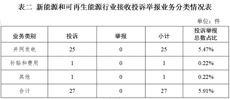 新能源和可再生能源行業(yè)排在第二位,數(shù)量為27件、占投訴舉報(bào)總數(shù)的5.91%,主要集中在并網(wǎng)發(fā)電方面。