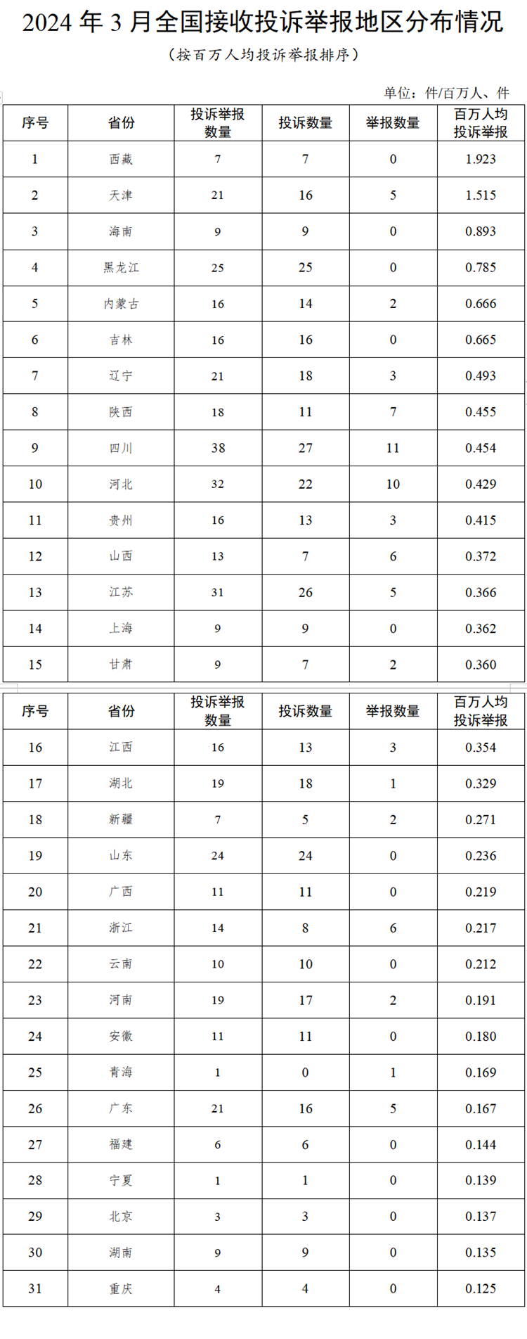 各省(自治區(qū)、直轄市)按照接收投訴舉報(bào)數(shù)量排序,四川、河北、江蘇、黑龍江、山東排在全國(guó)前5位。按百萬(wàn)人均投訴舉報(bào)數(shù)量排序,西藏、天津、海南、黑龍江、內(nèi)蒙古排在全國(guó)前5位。(2024年3月全國(guó)接收投訴舉報(bào)地區(qū)分布情況,見(jiàn)附件1)