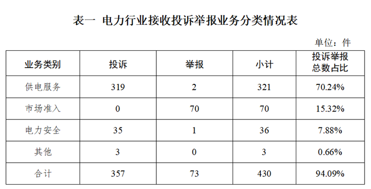 電力行業(yè)排在首位,數(shù)量為430件、占投訴舉報(bào)總數(shù)的94.09%,主要集中在供電服務(wù)、市場(chǎng)準(zhǔn)入、電力安全等方面。
