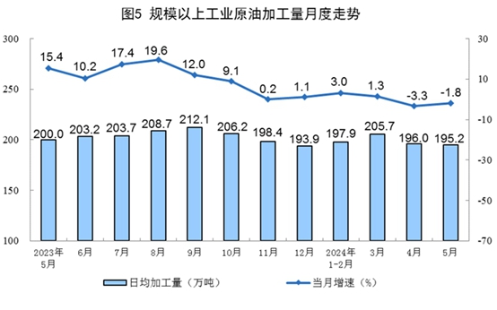 原油加工降幅收窄。5月份,規(guī)上工業(yè)原油加工量6052萬噸,同比下降1.8%,降幅比4月份收窄1.5個百分點;日均加工195.2萬噸。1—5月份,規(guī)上工業(yè)原油加工量30177萬噸,同比增長0.3%。
