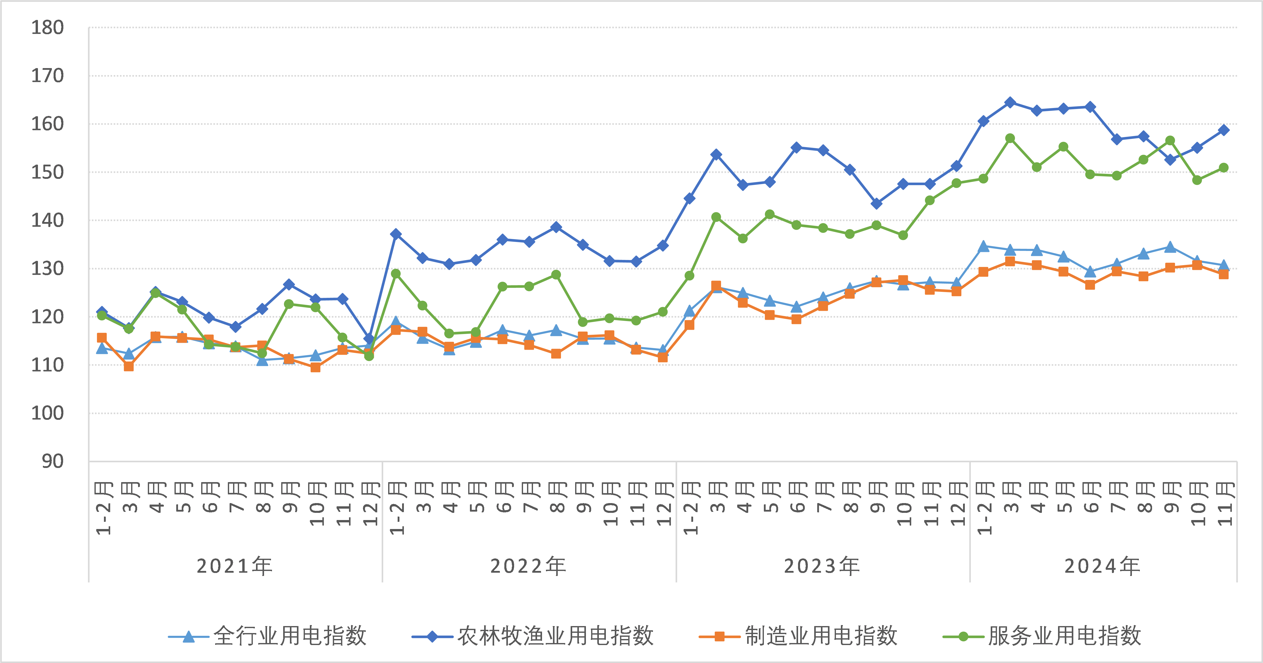 11月,農(nóng)林牧漁業(yè)用電指數(shù)為158.8,比2020年基期增長了58.8%,年均增長12.3%,同比增長7.6%。