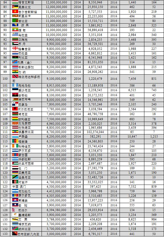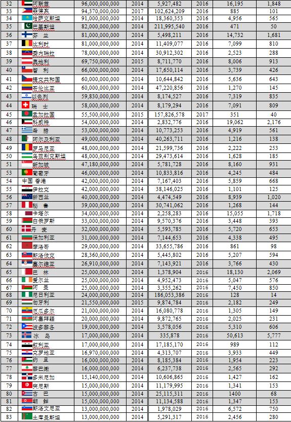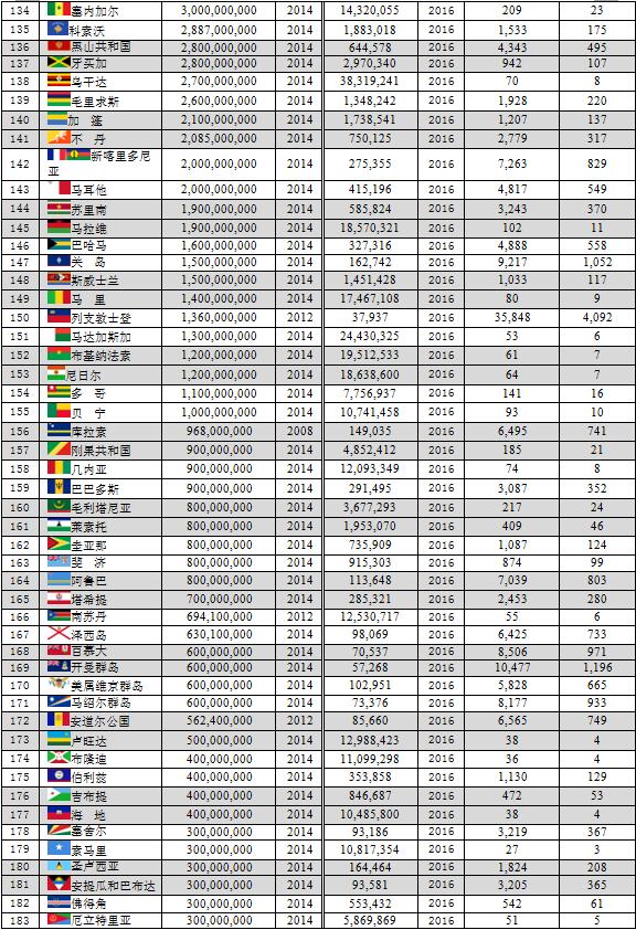 本文數(shù)據(jù)主要由美國中央情報局(CIA)統(tǒng)計,但個別國家如中國、印度尼西亞、阿聯(lián)酋、菲律賓、尼泊爾、北馬里亞納群島等由該國的統(tǒng)計機構統(tǒng)計。