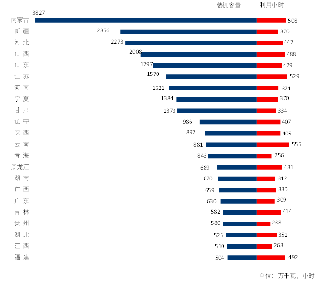 圖3 1-2月份風電裝機較多省份風電裝機容量和設(shè)備利用小時