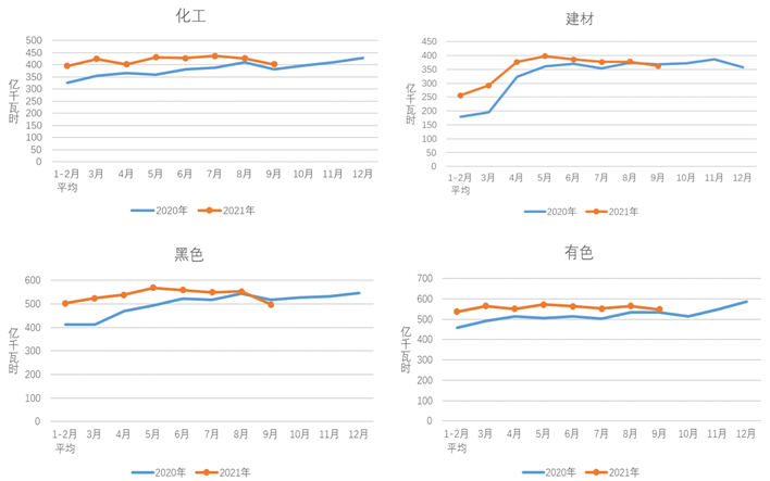 1-9月,化工行業(yè)用電量3740億千瓦時,同比增長8.9%,增速比上年同期提高9.5個百分點;建材行業(yè)用電量3084億千瓦時,同比增長12.3%,增速比上年同期提高11.4個百分點;黑色金屬冶煉行業(yè)用電量4800億千瓦時,同比增長10.6%,增速比上年同期提高8.3個百分點;有色金屬冶煉行業(yè)用電量4996億千瓦時,同比增長7.3%,增速比上年同期提高3.9個百分點。