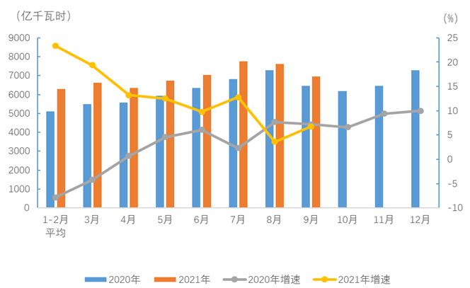 1-9月,全國全社會用電量61651億千瓦時,同比增長12.9%,其中,9月份全國全社會用電量6947億千瓦時,同比增長6.8%。
