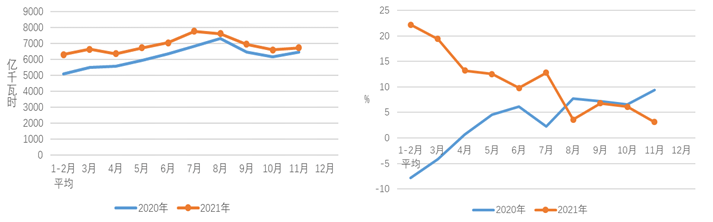 1-11月份,全國工業(yè)用電量同比增長10.2%,增速同比提高8.1個百分點。全國制造業(yè)用電量同比增長10.9%,增速同比提高8.5個百分點。制造業(yè)中,四大高載能行業(yè)合計用電量同比增長7.4%,其中,建材行業(yè)同比增長8.3%,黑色行業(yè)同比增長7.7%,化工行業(yè)同比增長7.4%,有色行業(yè)用電量同比增長6.4%;高技術(shù)及裝備制造業(yè)合計用電同比增長17.0%,其中,電氣機械和器材制造業(yè)、計算機/通信和其他電子設備制造業(yè)、通用設備制造業(yè)、儀器儀表制造業(yè)、汽車制造業(yè)同比增長超過15%,分別為25.2%、21.1%、17.5%、17.1%和16.8%;消費品制造業(yè)合計用電同比增長13.6%,其中,家具制造業(yè)、紡織服裝/服飾業(yè)、文教/工美/體育和娛樂用品制造業(yè)、木材加工和木/竹/藤/棕/草制品業(yè)、皮革/毛皮/羽毛及其制品和制鞋業(yè)、紡織業(yè)同比增長超過15%,分別為19.9%、18.4%、18.1%、17.8%、17.0%和16.0%。