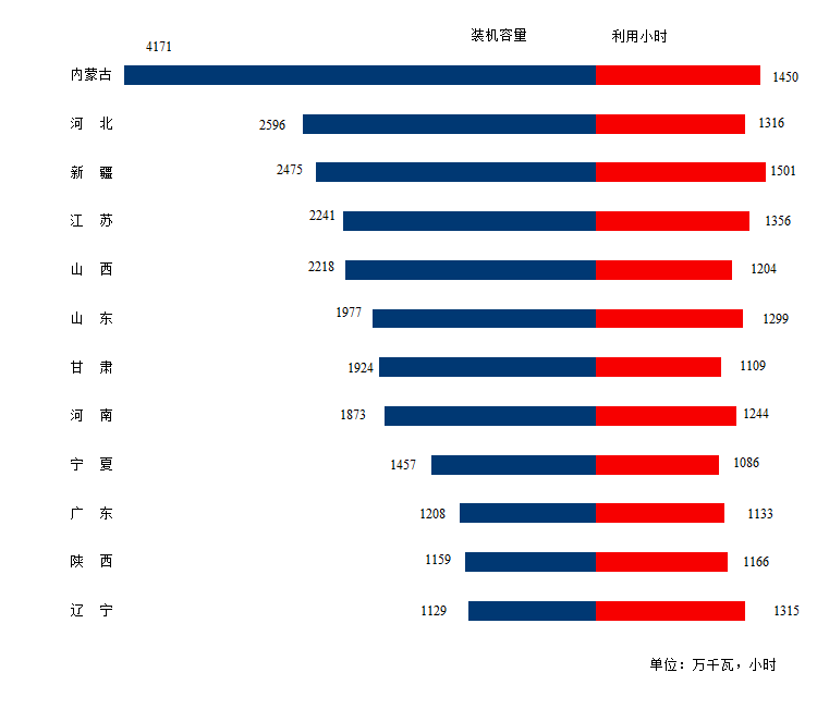 圖3 1-7月份風(fēng)電裝機較多省份風(fēng)電裝機容量和設(shè)備利用小時