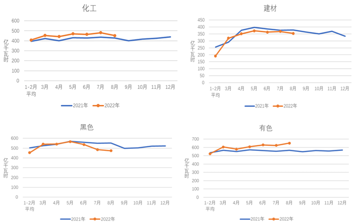 8月份,化工行業(yè)用電量452億千瓦時,同比增長2.7%;建材行業(yè)用電量354億千瓦時,同比下降6.7%;黑色金屬冶煉行業(yè)用電量474億千瓦時,同比下降15.0%;有色金屬冶煉行業(yè)用電量652億千瓦時,同比增長7.1%。