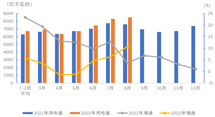 圖1 2021、2022年分月全社會用電量及其增速