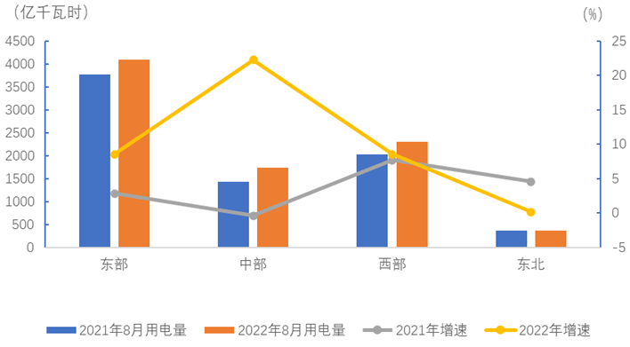 8月份,東、中、西部和東北地區(qū)全社會用電量增速分別為8.6%、22.3%、8.6%和0.2%。
