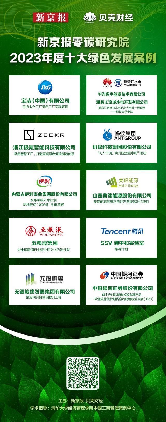 12月12日,在新京報(bào)零碳研究院2023綠色發(fā)展峰會(huì)上,由新京報(bào)零碳研究院和清華大學(xué)經(jīng)管學(xué)院中國(guó)工商管理案例中心共同評(píng)選出的“2023年度綠色發(fā)展十大案例”正式公布。入圍案例涵蓋新能源大規(guī)模開(kāi)發(fā)利用、城市生態(tài)治理、綠色制造、低碳技術(shù)、碳足跡、碳金融和碳普惠等重點(diǎn)領(lǐng)域,基本代表了2023年度綠色發(fā)展的主要方向。其中,中國(guó)銀河、無(wú)錫城建、螞蟻集團(tuán)、伊利、騰訊、寶潔中國(guó)、五糧液、極氪、山西美錦能源、華為數(shù)字能源等項(xiàng)目入圍。加強(qiáng)“雙碳”相關(guān)項(xiàng)目和技術(shù)試點(diǎn)示范對(duì)推動(dòng)和引領(lǐng)經(jīng)濟(jì)社會(huì)各領(lǐng)域綠色低碳轉(zhuǎn)型至關(guān)重要。
