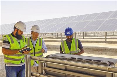 由中國(guó)企業(yè)總承包的阿聯(lián)酋艾爾達(dá)芙拉光伏電站可供20萬(wàn)戶居民用電,每年減少二氧化碳排放240萬(wàn)噸,使清潔能源在阿聯(lián)酋總能源結(jié)構(gòu)中的比重提高到13%以上。圖為中外員工在艾爾達(dá)芙拉光伏電站工作。本報(bào)中東中心分社 納達(dá)爾·達(dá)烏德攝