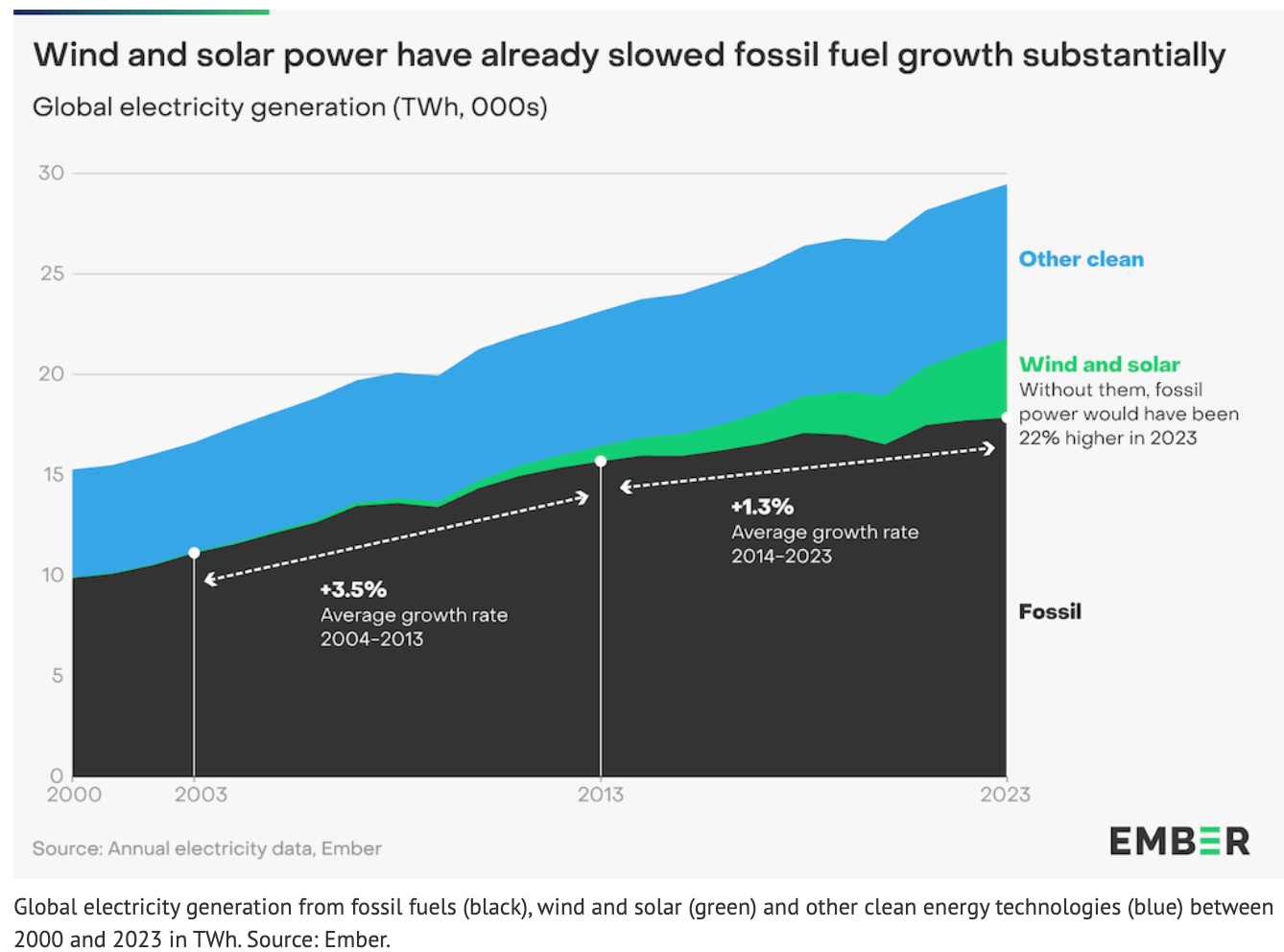 在全球范圍內(nèi),風(fēng)能和太陽能現(xiàn)在的增長速度已經(jīng)足以超過不斷增長的電力需求,這意味著從2024年起,全球化石燃料發(fā)電量和排放量將達(dá)到峰值。因此,化石燃料發(fā)電量下降的新時代即將到來。2023年可再生能源滿足了創(chuàng)紀(jì)錄的30%的全球電力需求,如果不是這一年水力發(fā)電的創(chuàng)紀(jì)錄下降,2023年排放量可能已經(jīng)達(dá)到峰值。風(fēng)能和太陽能的崛起阻礙了化石燃料發(fā)電的增長,如果沒有風(fēng)能和太陽能,2023年化石燃料發(fā)電將增長22%,本會使全球年排放量增加約40億噸二氧化碳。