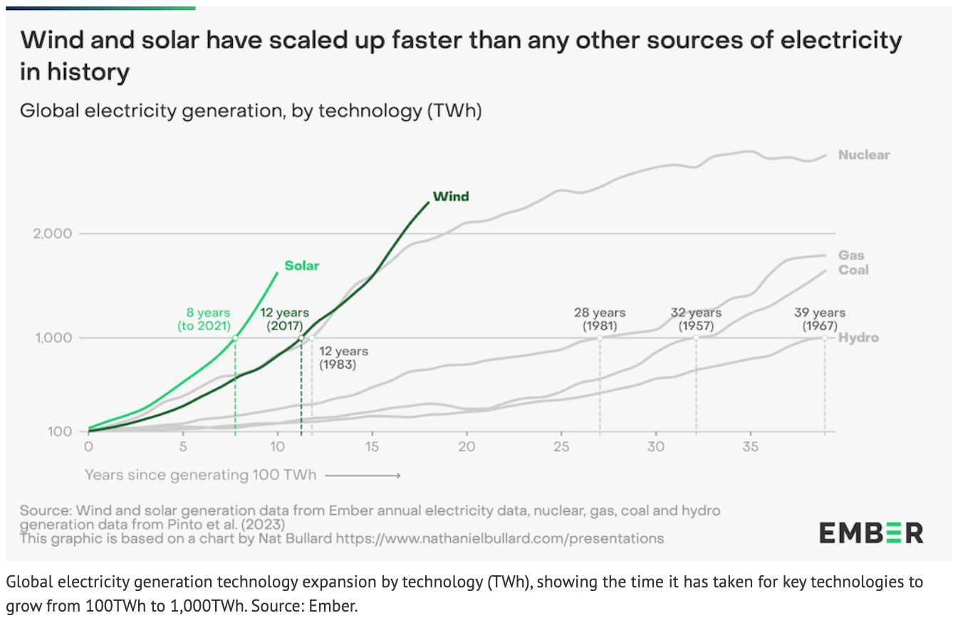 根據(jù)智庫Ember的最新報告分析,在全球范圍內(nèi)風(fēng)能和太陽能的增長速度比歷史上任何其他電力來源都快。太陽能和風(fēng)能從每年100太瓦時增長到1000太瓦時,分別只花了8年和12年的時間。同樣是100太瓦時到1000太瓦時,天然氣電廠花了28年、煤電化了32年、水電花了39年。