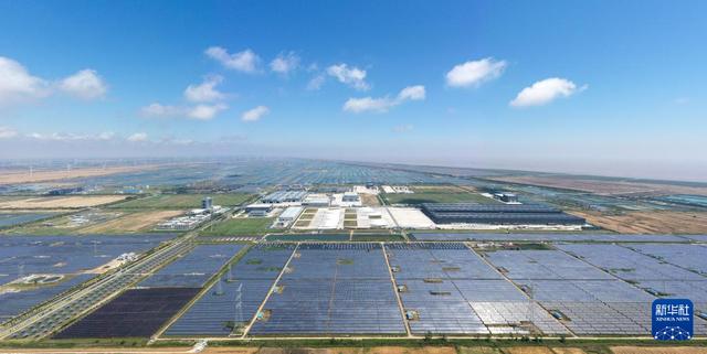6月6日在射陽港低(零)碳產(chǎn)業(yè)園拍攝的長廊頂部太陽能光伏系統(tǒng)(無人機照片)。新華社記者 楊磊 攝