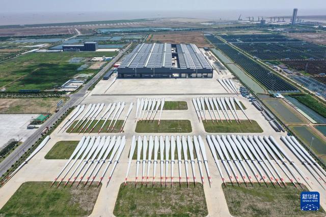 6月6日拍攝的位于射陽港低(零)碳產(chǎn)業(yè)園的射陽中車風(fēng)電葉片工程有限公司的外景照片(無人機照片)。新華社記者 楊磊 攝