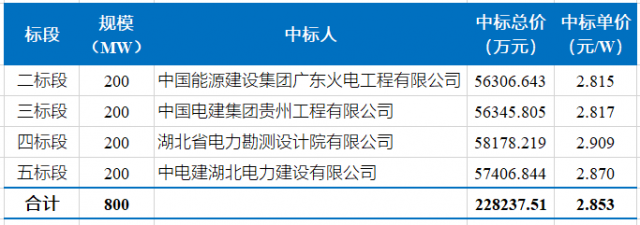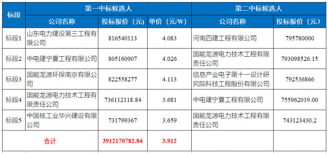 “寧湘直流”配套新能源基地中衛(wèi)3GW一期1GW,5個(gè)標(biāo)段的開(kāi)標(biāo)結(jié)果如下表所示。