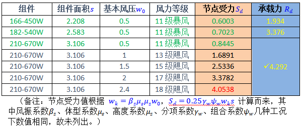 再以青海省作為項目實例說明,取全省最大基本風(fēng)壓0.5kN/m2為計算值,參考規(guī)范GB5009-2012《荷載規(guī)范》、GB 50429-2007 《鋁合金結(jié)構(gòu)設(shè)計規(guī)范》、NB/T10115-2018《光伏支架結(jié)構(gòu)設(shè)計規(guī)程》可知,全省范圍內(nèi)節(jié)點處作用力遠小于組件連接處承載力,三款參考組件都處于安全狀態(tài)。(下表綠色數(shù)字部分)