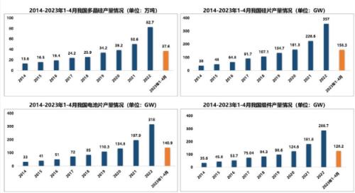 2022年,我國多晶硅產(chǎn)量85.7萬噸,連續(xù)十二年位居世界首位,占全球產(chǎn)量的85.6%;國內(nèi)硅片產(chǎn)量371.3GW,占全球產(chǎn)量的97.4%;國內(nèi)電池片產(chǎn)量約330.6GW,同比增長67.1%,占全球產(chǎn)量的90.3%;國內(nèi)組件產(chǎn)量約294.7GW,同比增長62.1%,占全球產(chǎn)量的84.8%。