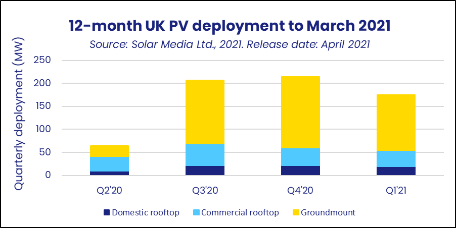 截止到3月底的12個月中,英國新增并網(wǎng)太陽能發(fā)電容量660兆瓦。根據(jù)英國太陽能協(xié)會數(shù)據(jù),預(yù)計2021年,全國新增安裝量可能達(dá)到1,000兆瓦,因為在三個主要市場,即住宅,商業(yè)屋頂和地面安裝市場均實現(xiàn)增長。