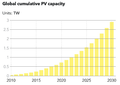 挪威船級社DNV在其最新的技術(shù)報(bào)告中表示,到2025年,全球太陽能裝機(jī)容量將翻一番,到2030年將翻兩番,達(dá)到3,000吉瓦。