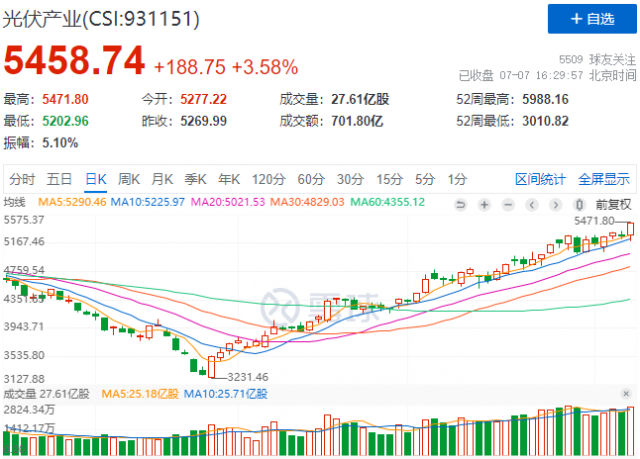 7月7日,光儲逆變器概念股全線暴漲,帶領光伏板塊再創(chuàng)反彈新高!中證光伏產(chǎn)業(yè)指數(shù)(CSI:931151)報收5459點,大漲3.58%!自4月27日低點以來,漲幅高達69%,大幅跑贏A股市場!