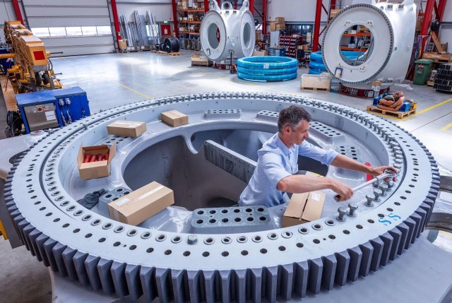 ▲德國羅斯托克,Eno能源公司的一名員工在風力渦輪機軸承上工作。圖片來源:Jens Büttner/ Alamy