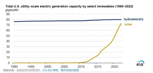 投資稅收抵免等激勵措施鼓勵了可再生能源發(fā)電能力的增長。截至2023年8月,美國太陽能裝機容量總計超過125吉瓦(GW),其中包括80吉瓦的公用事業(yè)規(guī)模太陽能容量和估計45吉瓦的小型太陽能容量。過去幾十年來,美國的水力發(fā)電容量相對穩(wěn)定地保持在80吉瓦左右。