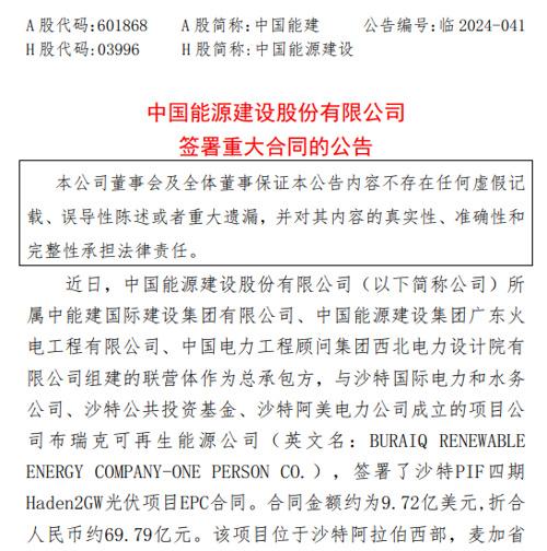 8月13日晚間,中國(guó)能建公告稱(chēng),公司簽署了沙特PIF四期Haden2GW光伏項(xiàng)目(以下簡(jiǎn)稱(chēng)沙特2GW光伏項(xiàng)目)EPC合同,金額約為9.72億美元(約合人民幣70億元)。