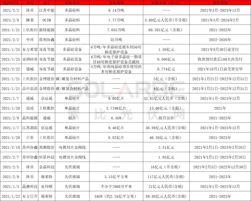 硅片方面,通威與京運(yùn)通、上機(jī)數(shù)控累計簽訂單晶硅片訂單超12億片;晶科能源向通威采購硅片6.5GW;江蘇潤陽向京運(yùn)通采購硅片9.46億片;正泰向上機(jī)數(shù)控采購單晶硅片8.82億片,以上合同采購期限均為2021-2023年。同時,蘇州協(xié)鑫與高測股份、恒星科技簽訂總價4.46億元的電鍍切片金剛線采購項目。
