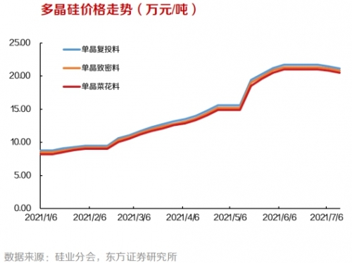 或許是在大擴產的預期下,近期硅料普遍價格由大漲轉向松動。根據(jù)硅業(yè)分會數(shù)據(jù),上周國內單晶復投料成交均價下滑至 20.81 萬元/噸,周環(huán)比降幅為 1.61%;單晶致密料成交均價下滑至 20.6 萬元/噸,周環(huán)比降幅為 1.06%;單晶菜花料成交均價下滑至 20.35 萬元/噸,周環(huán)比降幅 0.73%。