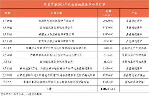 與此同時,國內多晶硅還原爐市占率第一、該細分領域絕對龍頭的雙良節(jié)能也受益頗豐(還原爐是生產多晶硅的重要設備),近三年來累計為行業(yè)各家硅料企業(yè)提供三百多臺大型高效還原爐。據(jù)公告統(tǒng)計,2021年以來公司已簽訂的多晶硅還原爐項目已高達15.02億元,相比2020全年多晶硅還原爐系統(tǒng)實現(xiàn)的1.77億元收入,大幅增長748.59%。