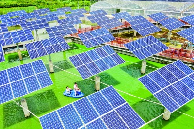 近年來,廣西壯族自治區(qū)蒙山縣因地制宜開展“光伏+漁業(yè)”的光伏發(fā)電項目,將原先一些洼澇地、荒地打造為“漁光互補(bǔ)”光伏電站,改變傳統(tǒng)的漁業(yè)養(yǎng)殖生產(chǎn)方式,實施農(nóng)光互補(bǔ),既符合國家清潔低碳能源發(fā)展戰(zhàn)略,又為該縣鄉(xiāng)村振興增添新力量。圖為8月17日,工人在“漁光互補(bǔ)”村級光伏電站喂養(yǎng)魚蝦。何華文攝/光明圖片