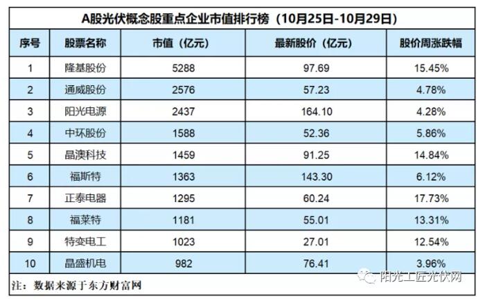 上周(10月25日-29日)光伏板塊再度爆發(fā),記者重點(diǎn)監(jiān)測的10家企業(yè)全線上漲,其中,正泰電器周度上漲17.73%,隆基股份上漲15.45%,晶澳科技漲了14.84%,福萊特上漲13.31%。晶澳科技、特變電工的最新市值分別為1459億元和1023億元,排名上升,成為排行榜第五、第九位。
