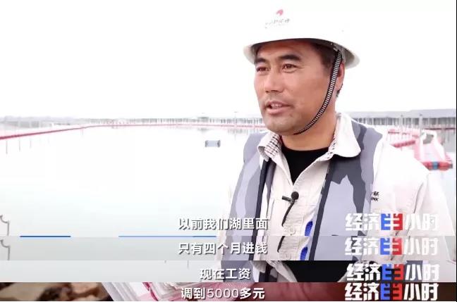 這天,周金飛他們整整賣了十車魚,拿到了1000元獎金。他現(xiàn)在不僅拿工資、領(lǐng)獎金,還有五險(xiǎn)一金的待遇保障。工資、獎金、湖面租金,一年收入將近十萬元。