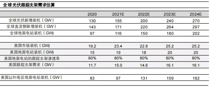 隨著跟蹤支架持續(xù)技術(shù)迭代,其經(jīng)濟(jì)性和可靠性等方面的性能持續(xù)提升,相對(duì)固定支架的優(yōu)勢(shì)有望進(jìn)一步凸顯,從而推動(dòng)跟蹤支架滲透率的提升。我們估算,未來3年內(nèi),全球跟蹤支架需求有望達(dá)到34%,美國(guó)以外地區(qū)的跟蹤支架需求的復(fù)合增速有望達(dá)到45%。