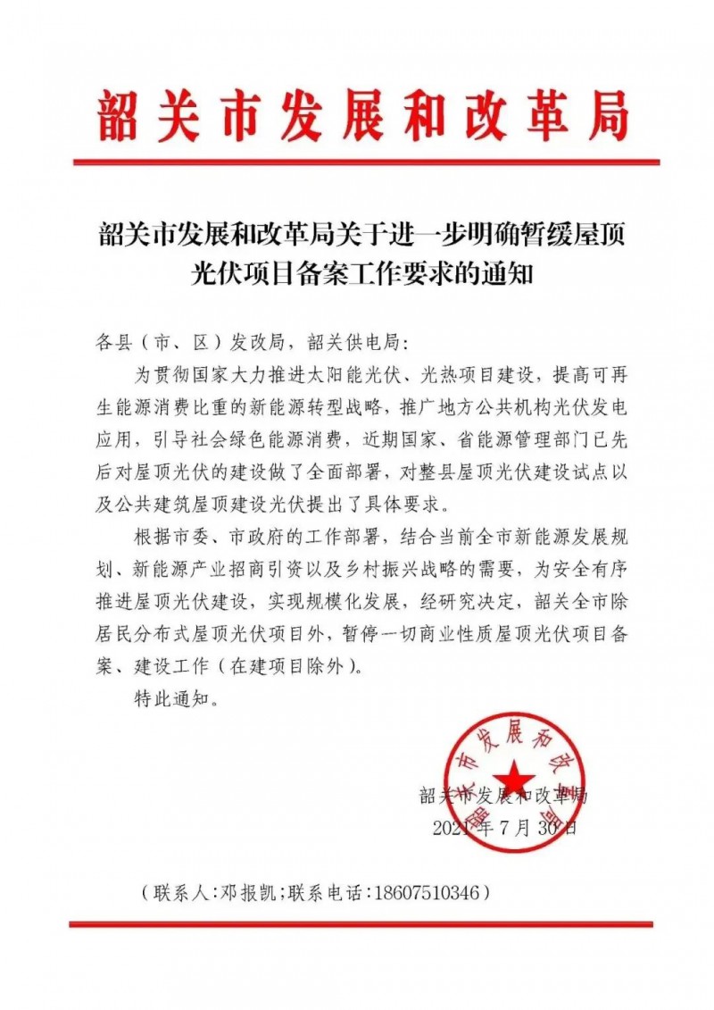 韶關市發(fā)改委發(fā)布關于進一步明確暫緩屋頂光伏項目備案工作要求的通知,通知明確:韶關全市除居民分布式屋頂光伏項目外,暫停一切商業(yè)性質屋頂光伏項目備案、建設工作(在建項目除外)。
