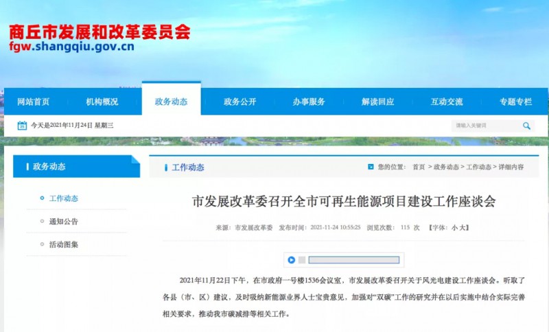 11月22日,商丘市發(fā)改委在市政府一號樓1536會議室,市發(fā)展改革委召開關(guān)于風(fēng)光電建設(shè)工作座談會。聽取了各縣(市、區(qū))建議,及時吸納新能源業(yè)界人士寶貴意見,加強對“雙碳”工作的研究并在以后實施中結(jié)合實際完善相關(guān)要求,推動我市碳減排等相關(guān)工作。